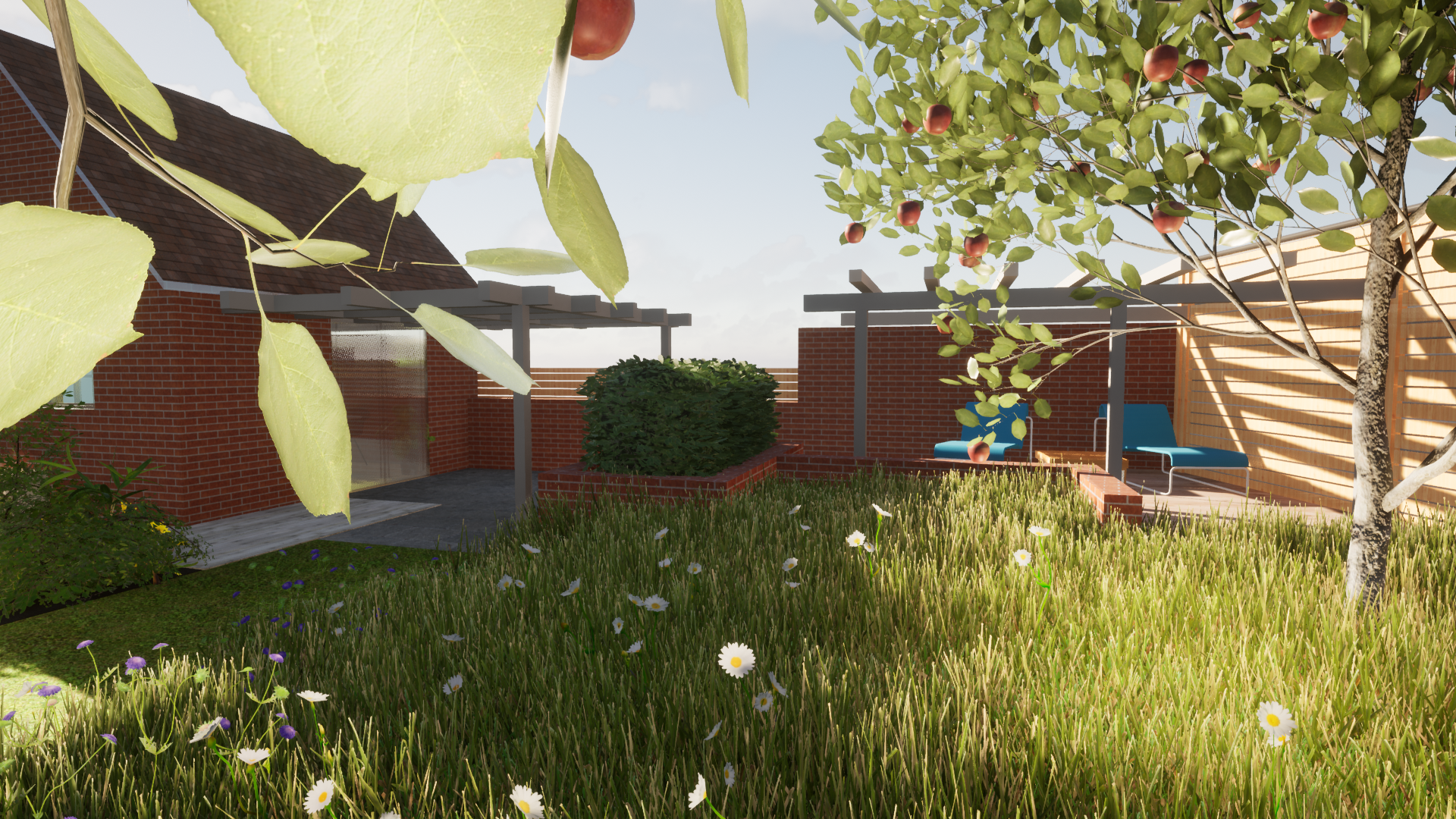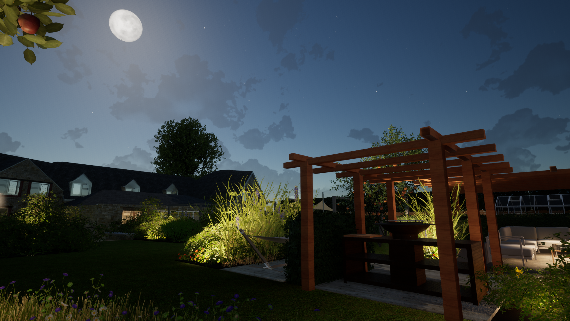 The path leads to the families’ entertaining and dining area. A secluded and intimate seating area is screened by planting. A dedicated barbeque area adjoins to allow easy access to the seating area. From the entertaining area a hammock sits in its own haven of tranquillity. Surrounded by grasses, acting as a natural, shimmering screen, a nearby water feature providing the soundtrack for anyone wishing to seek out some peace and quiet.